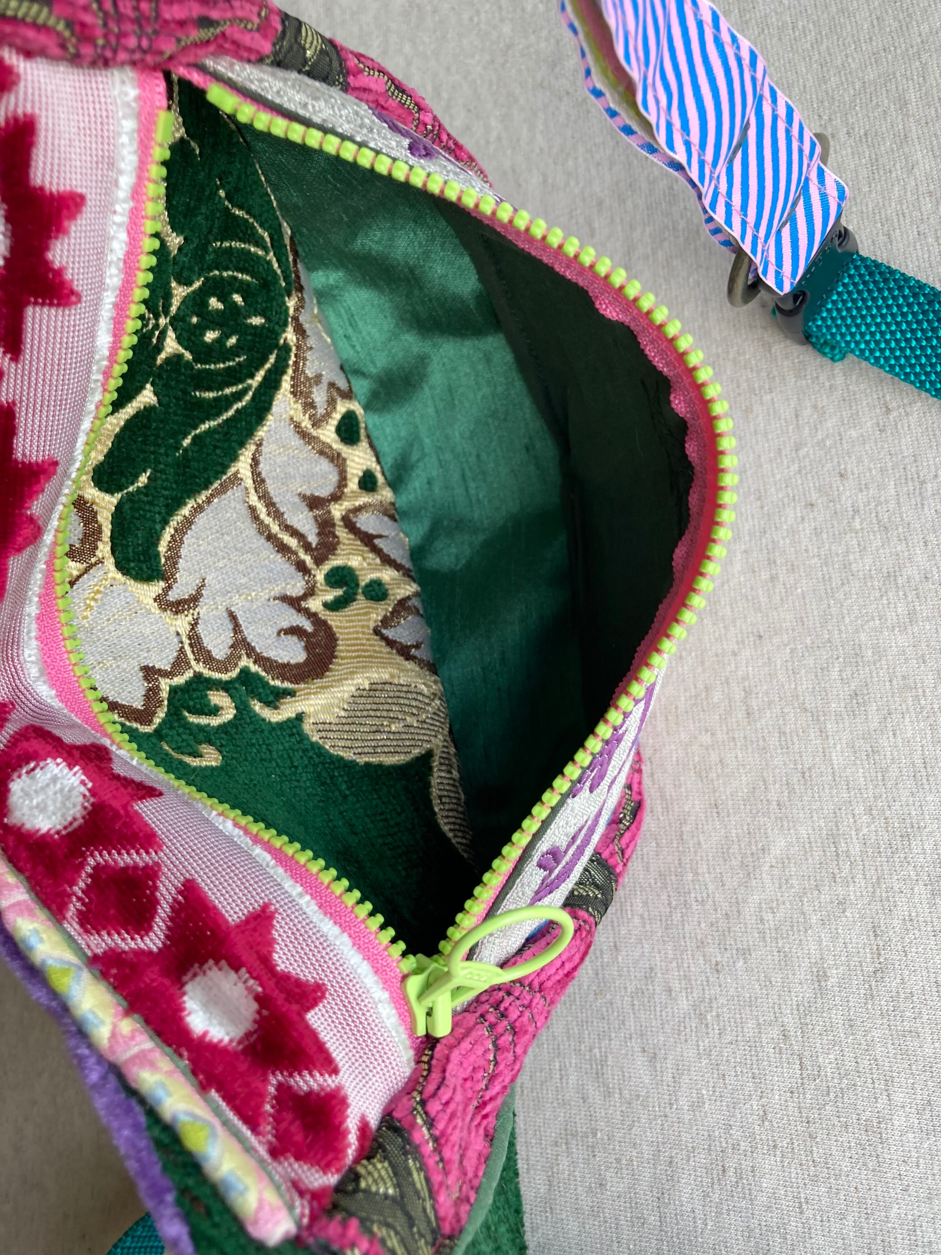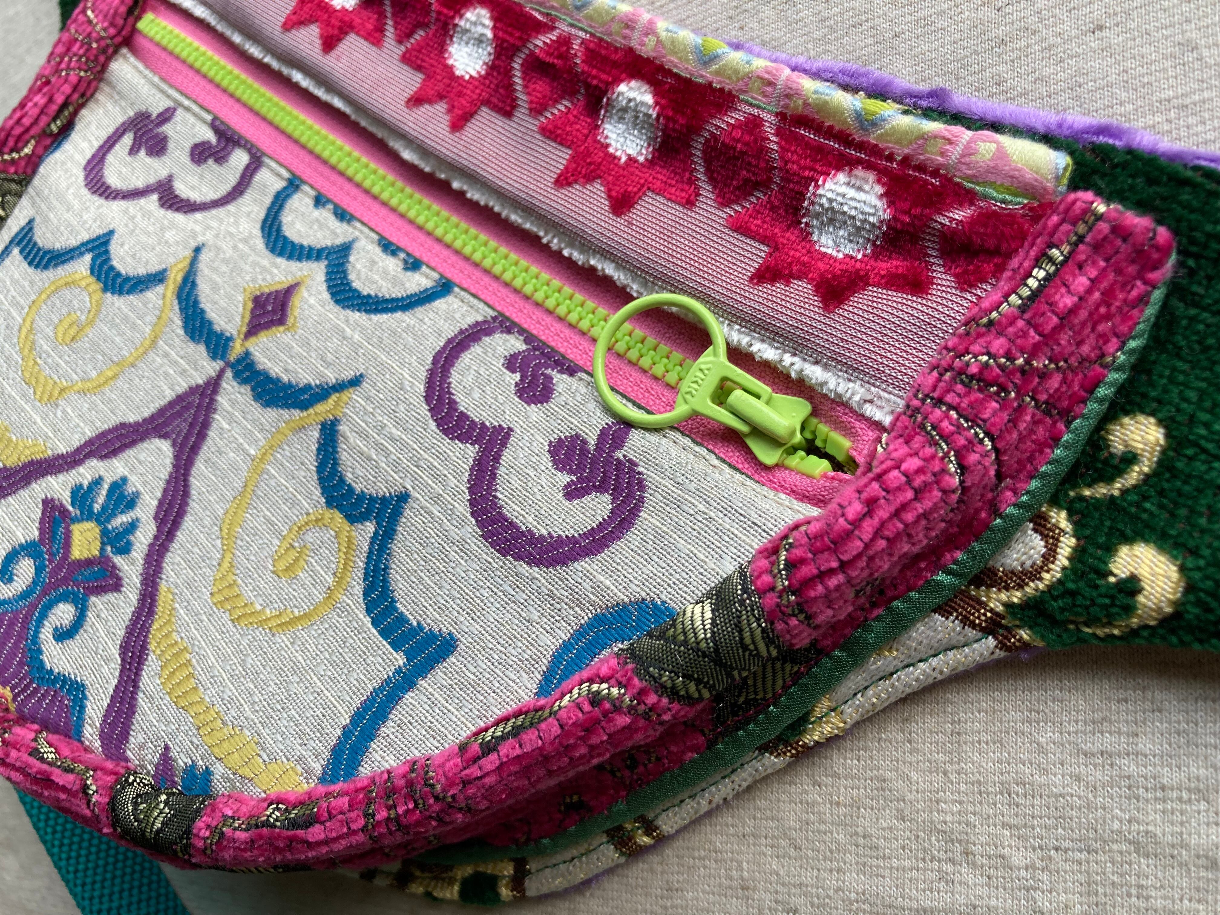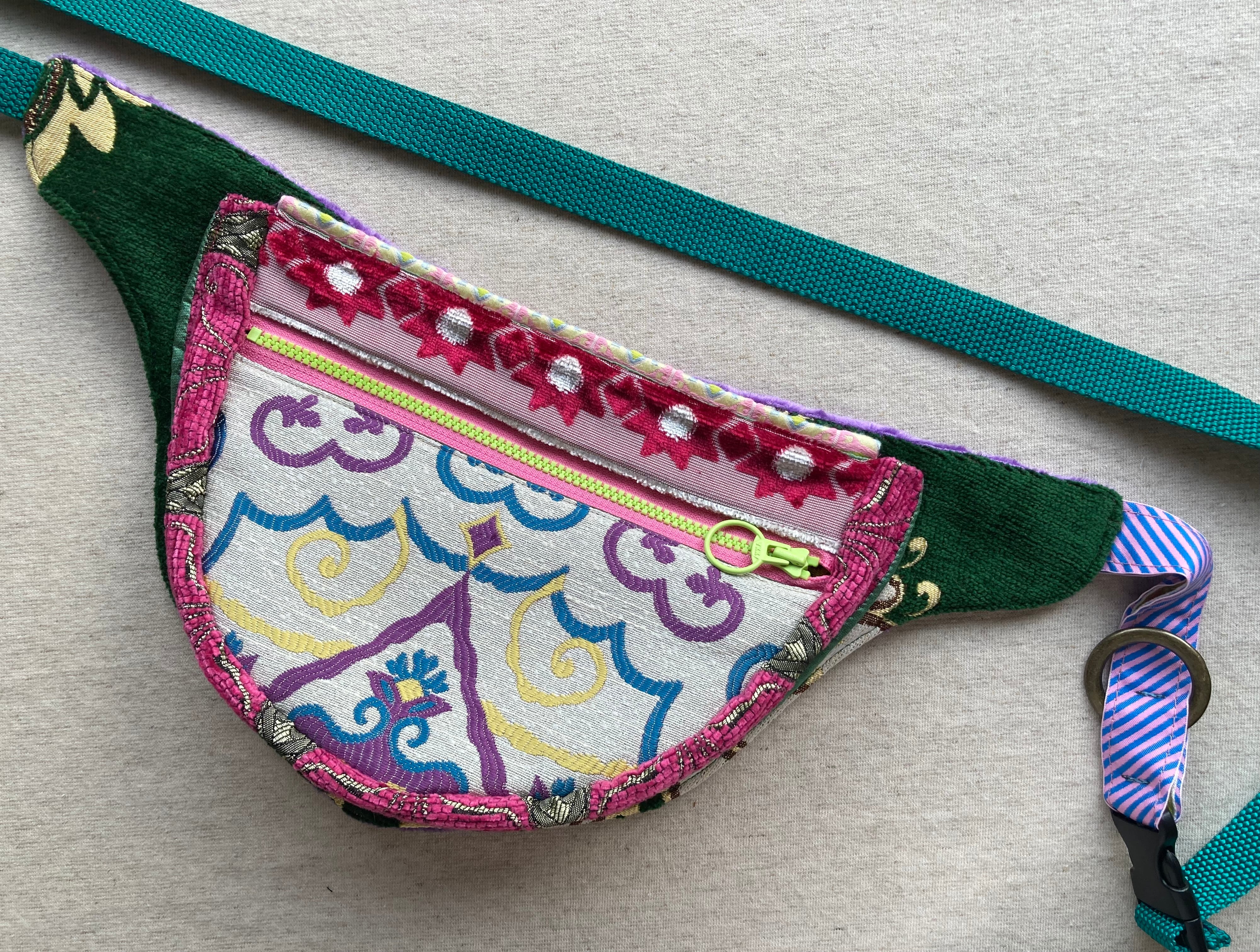 オリジナルデザインのウェストバッグ型ショルダーです。モロッコの生地をメインにmixしてオンリーワンに仕上げていますので、生地の上質な質感やカラフルな色合わせなどを楽しんでいただけたら嬉しいです。