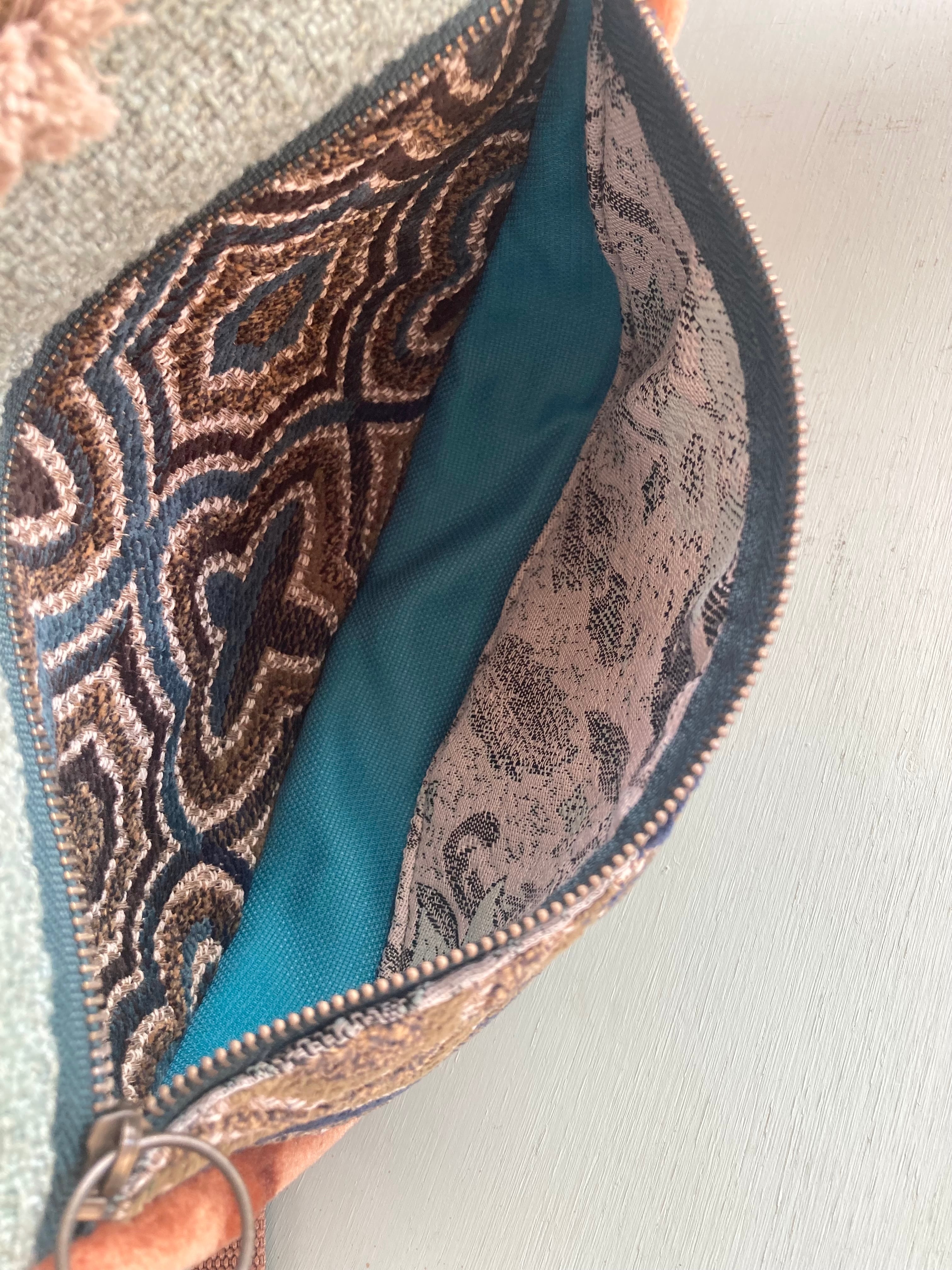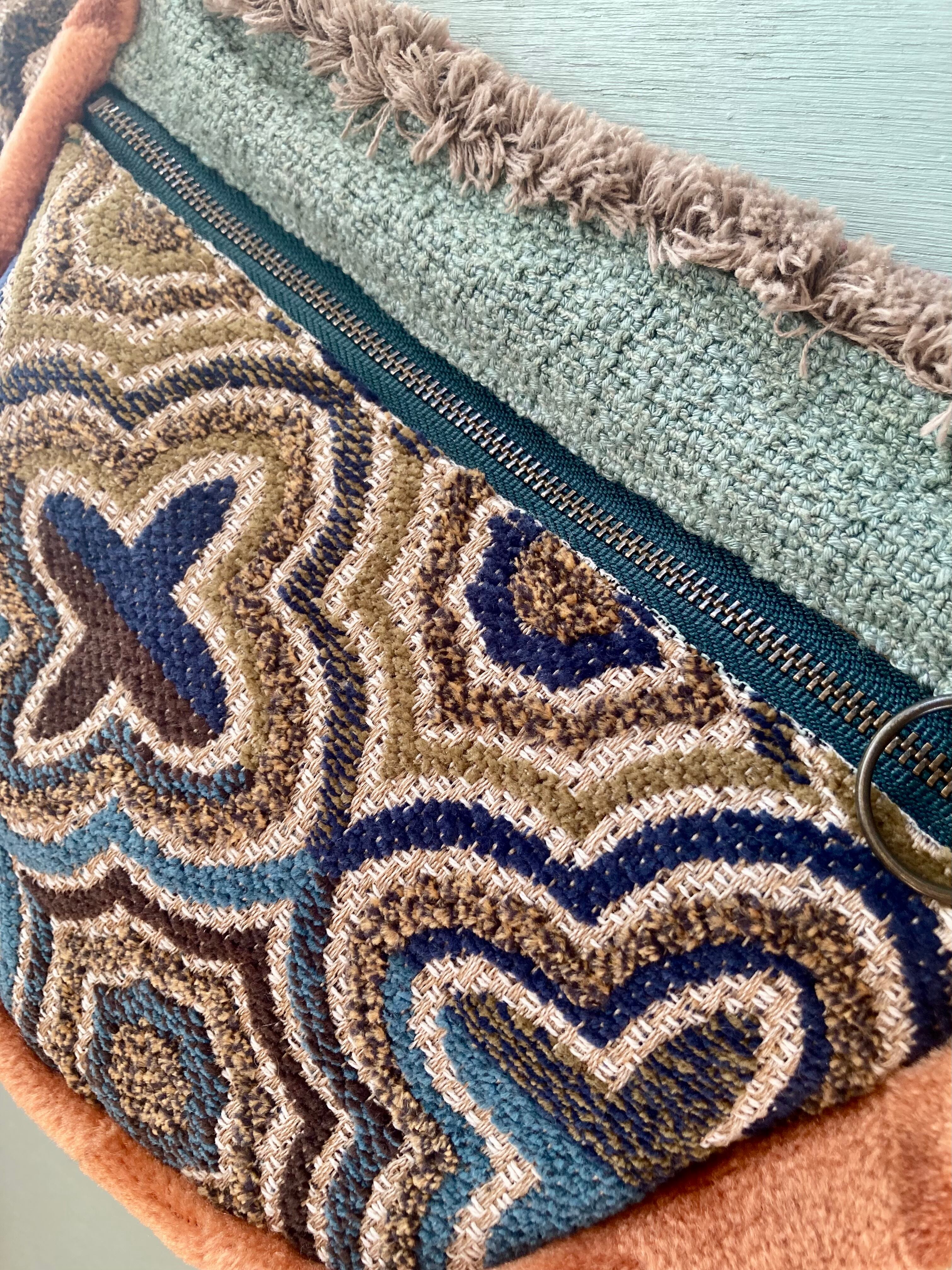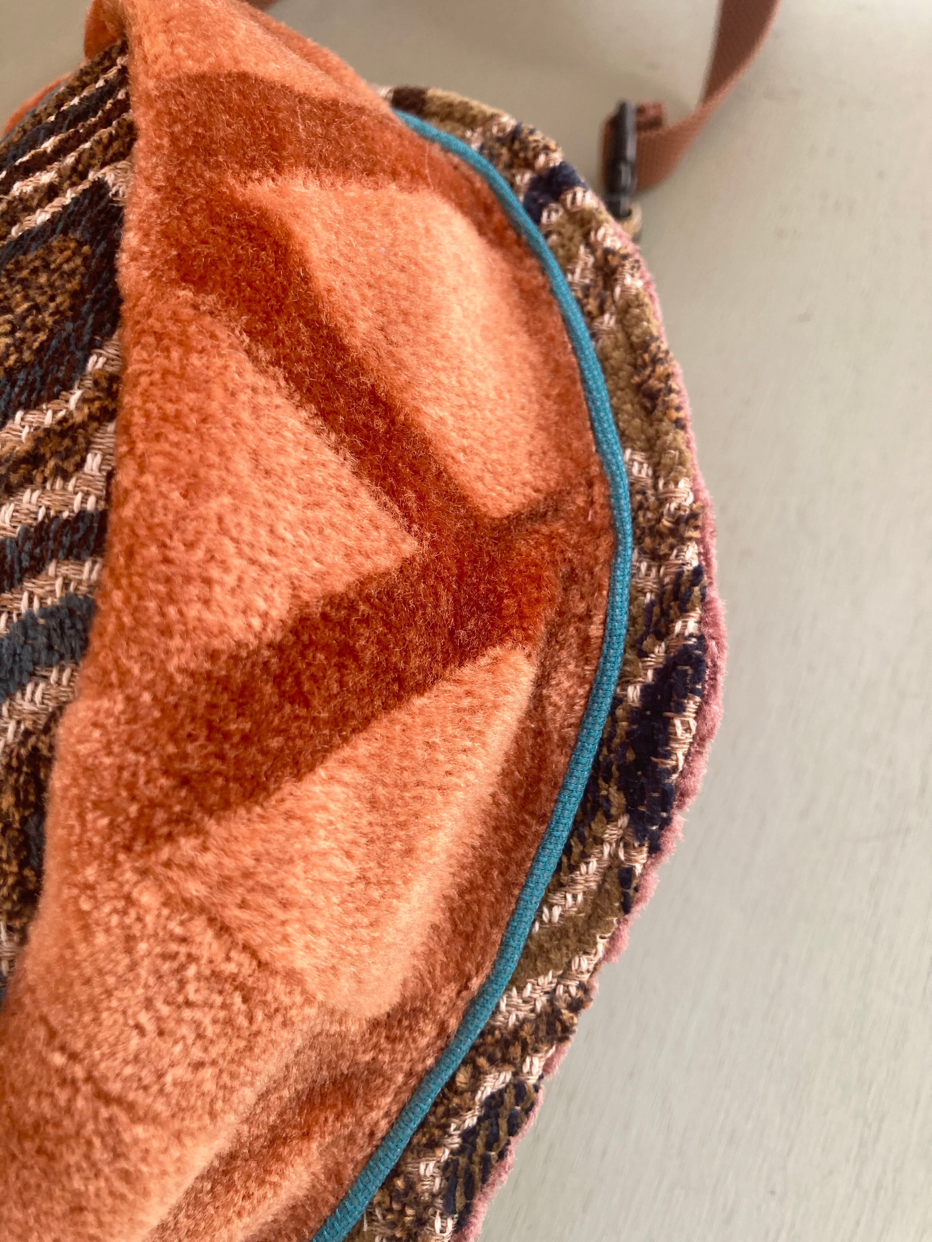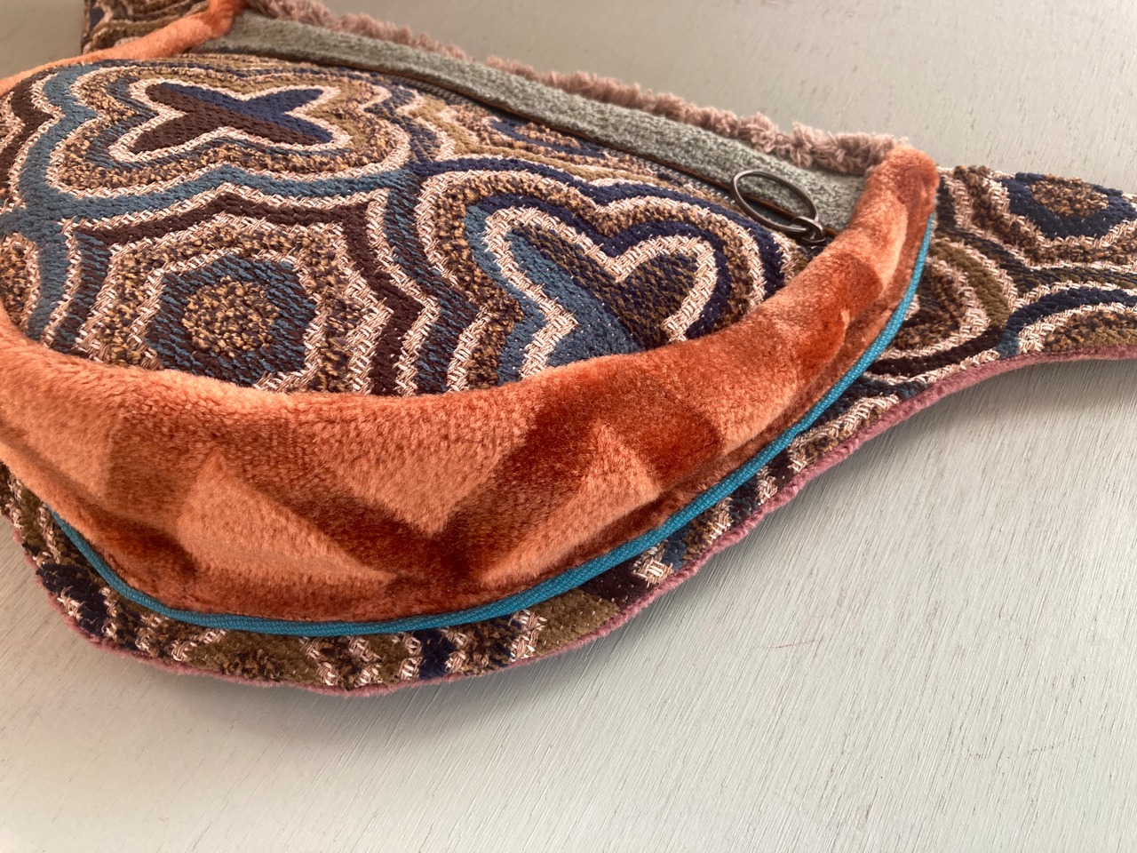 オリジナルデザインのウェストバッグ型ショルダーです。モロッコの生地をメインにmixしてオンリーワンに仕上げていますので、生地の上質な質感やカラフルな色合わせなどを楽しんでいただけたら嬉しいです。