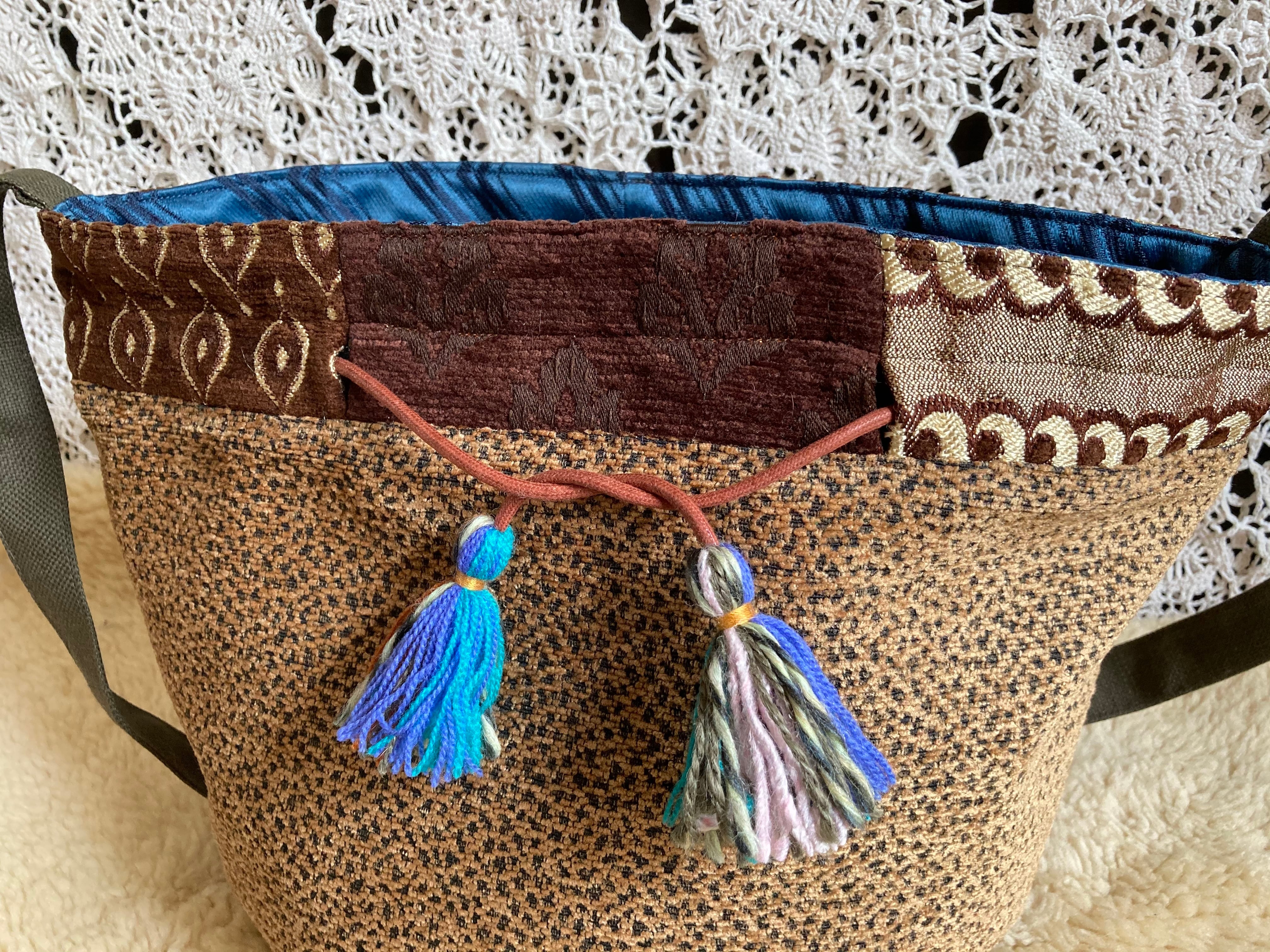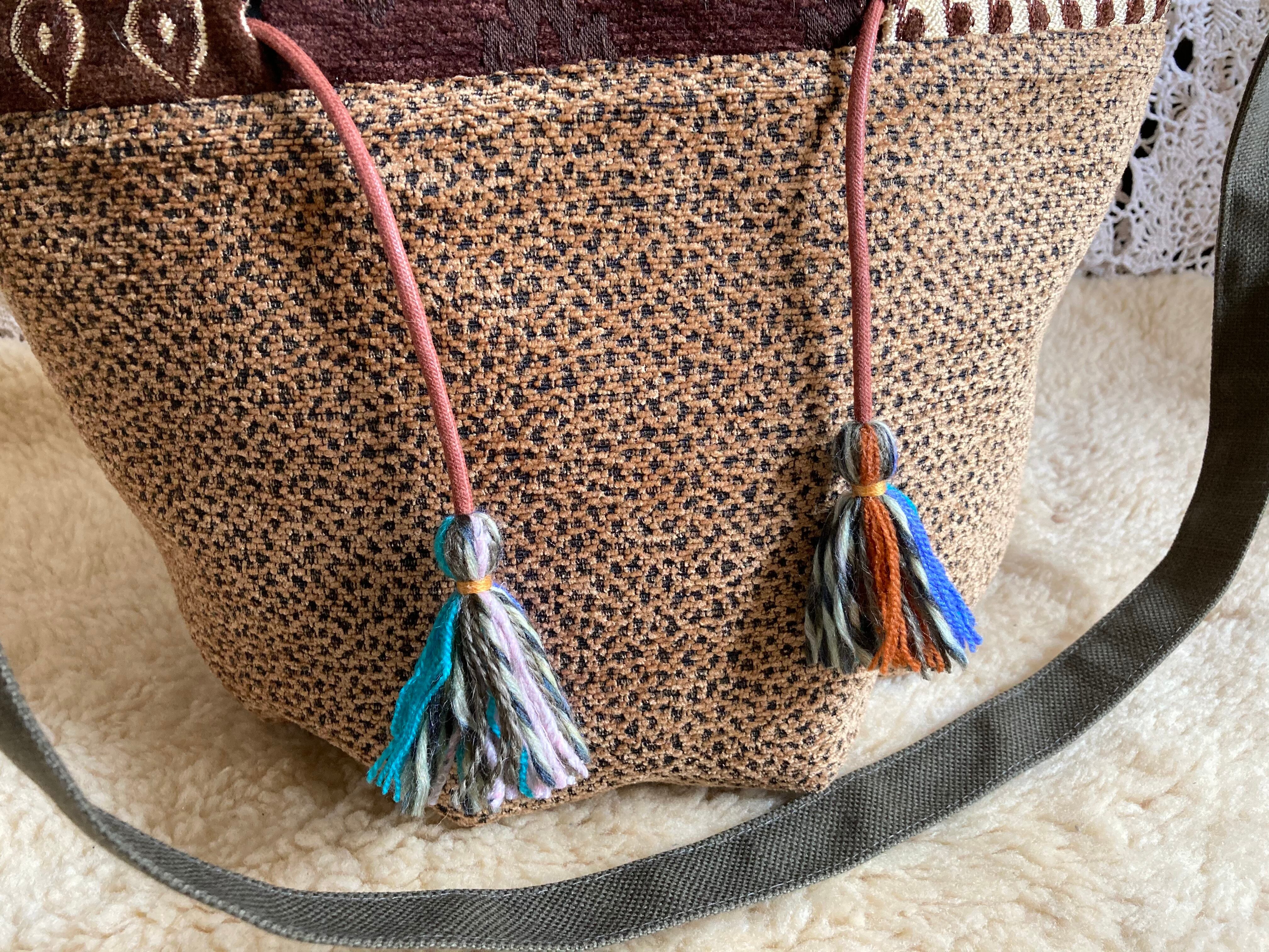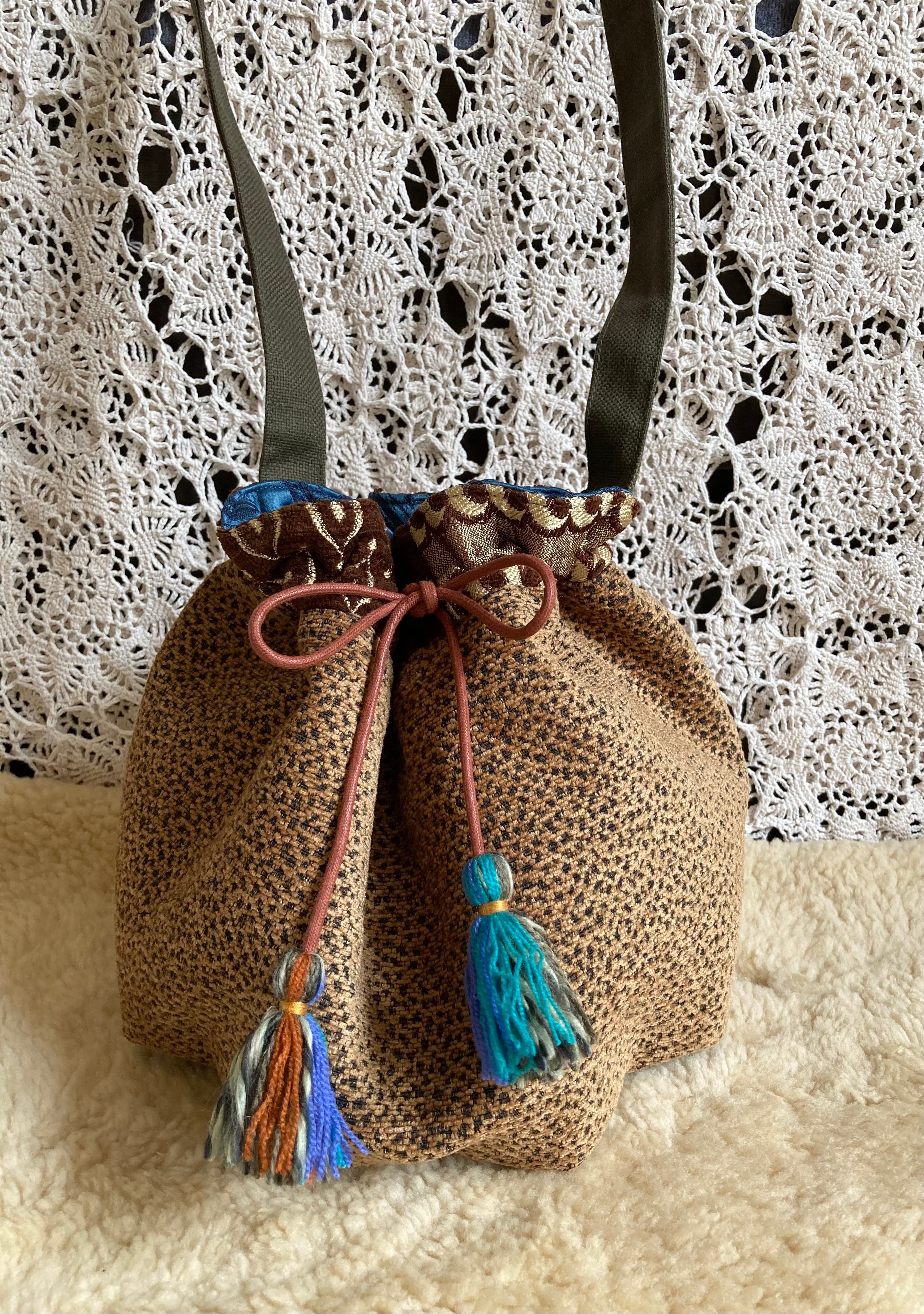 2wayで使える仕様なので、巾着型で肩掛けしたり、ヒモを縛らず斜めがけすればメッセンジャーバッグのように!底が目立ってなんともかわいいです。