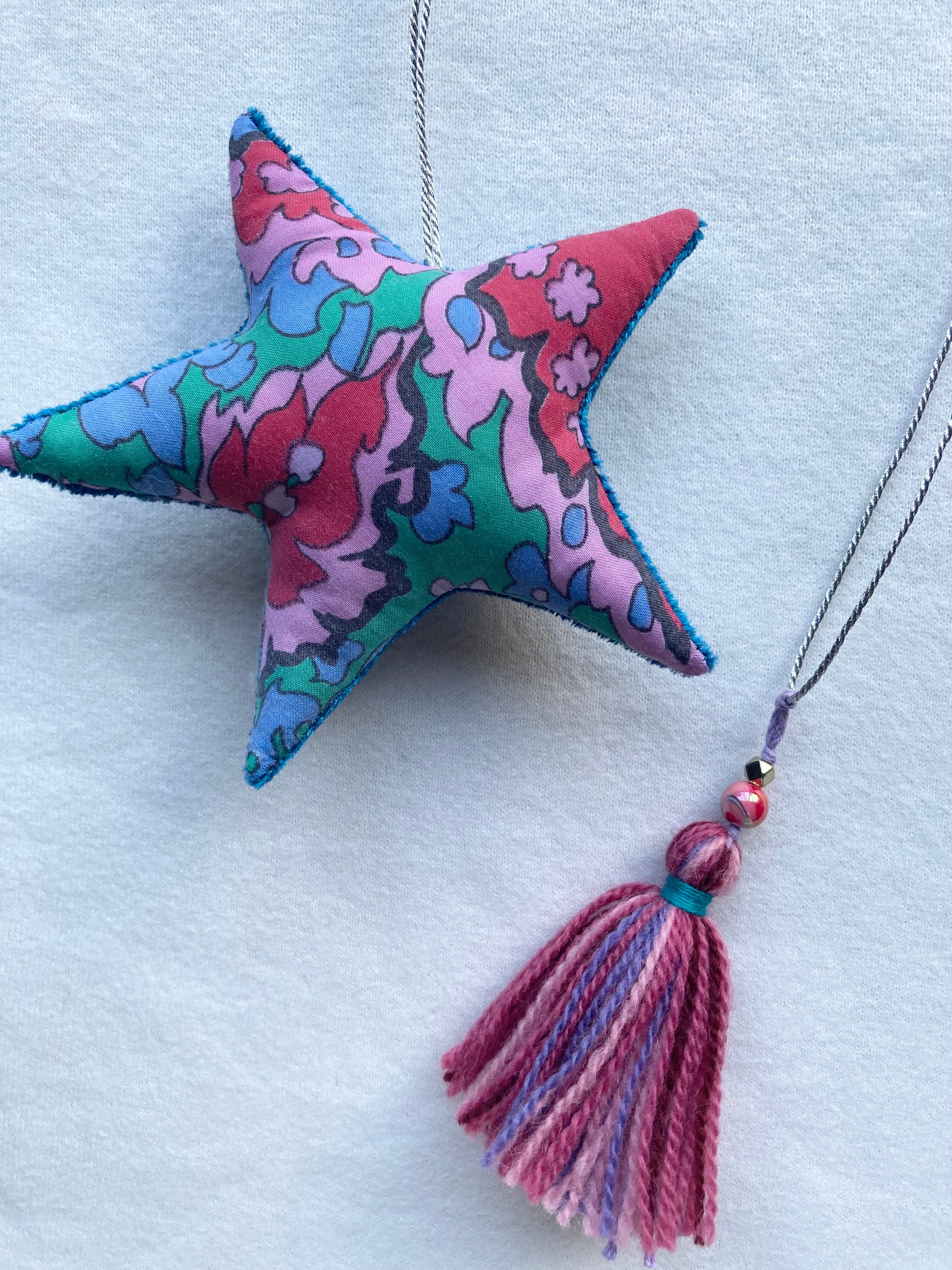 フランスのヴィンテージ生地や、アメリカ、アジア等を旅した生地で作るオーナメント。ベロアと組み合わせています。