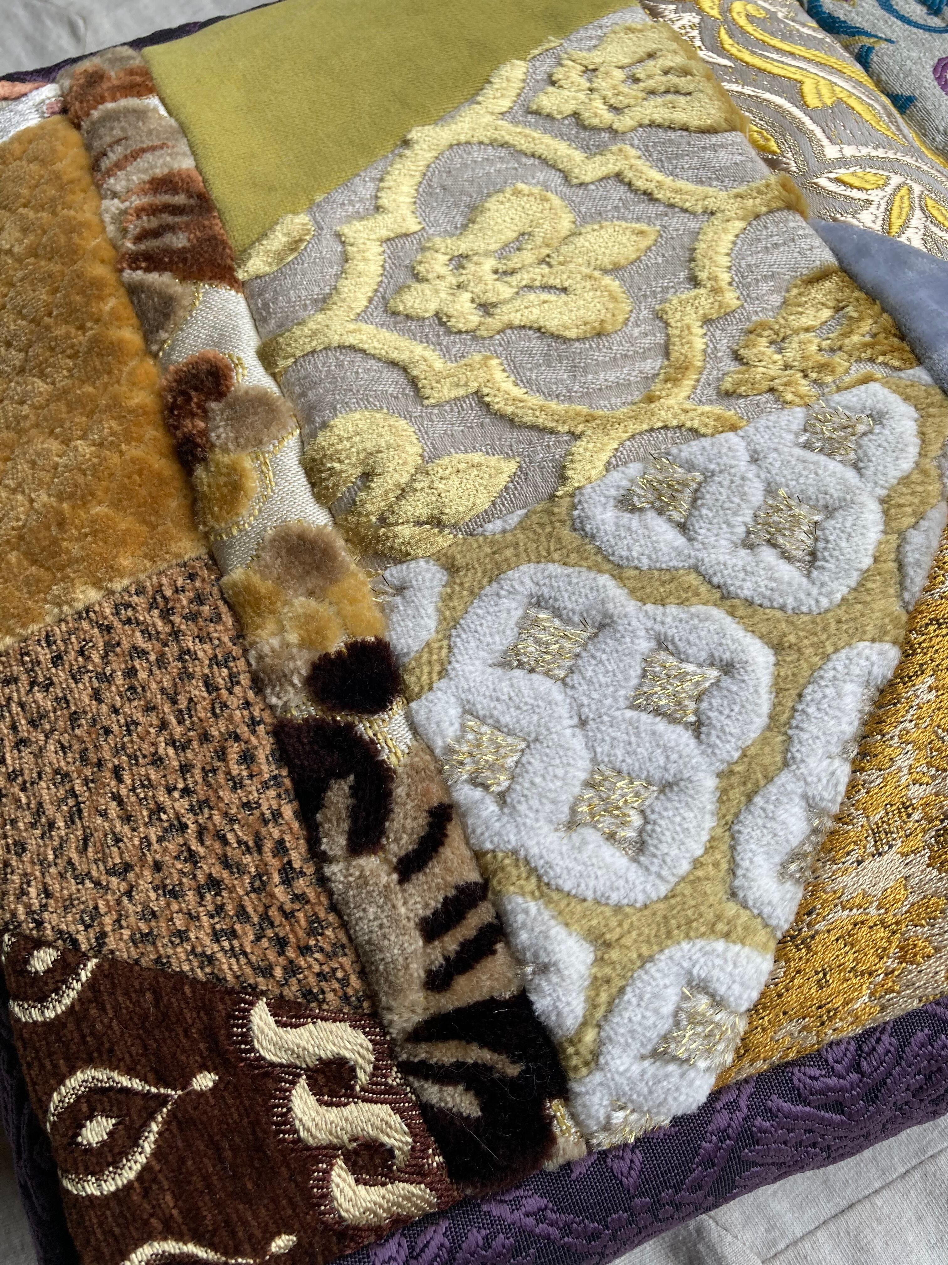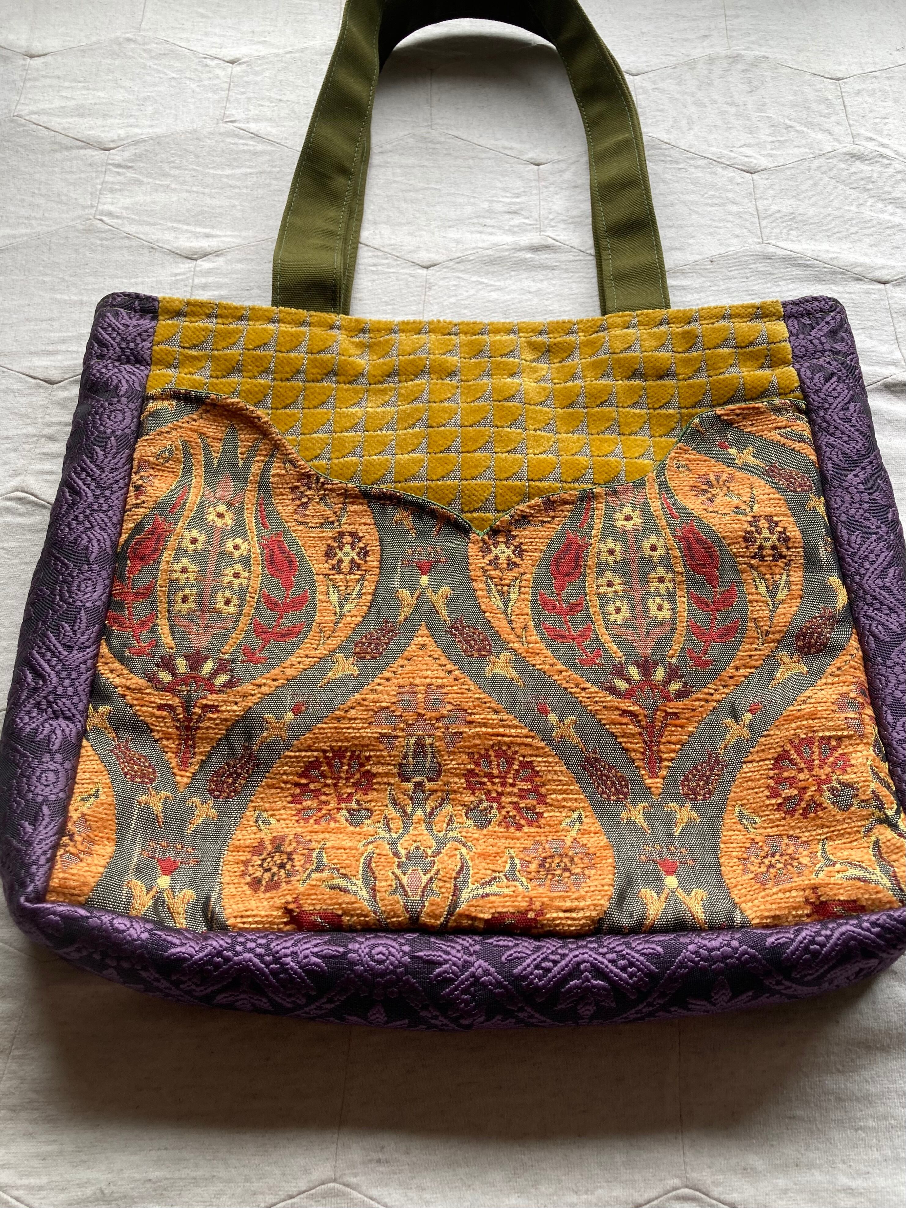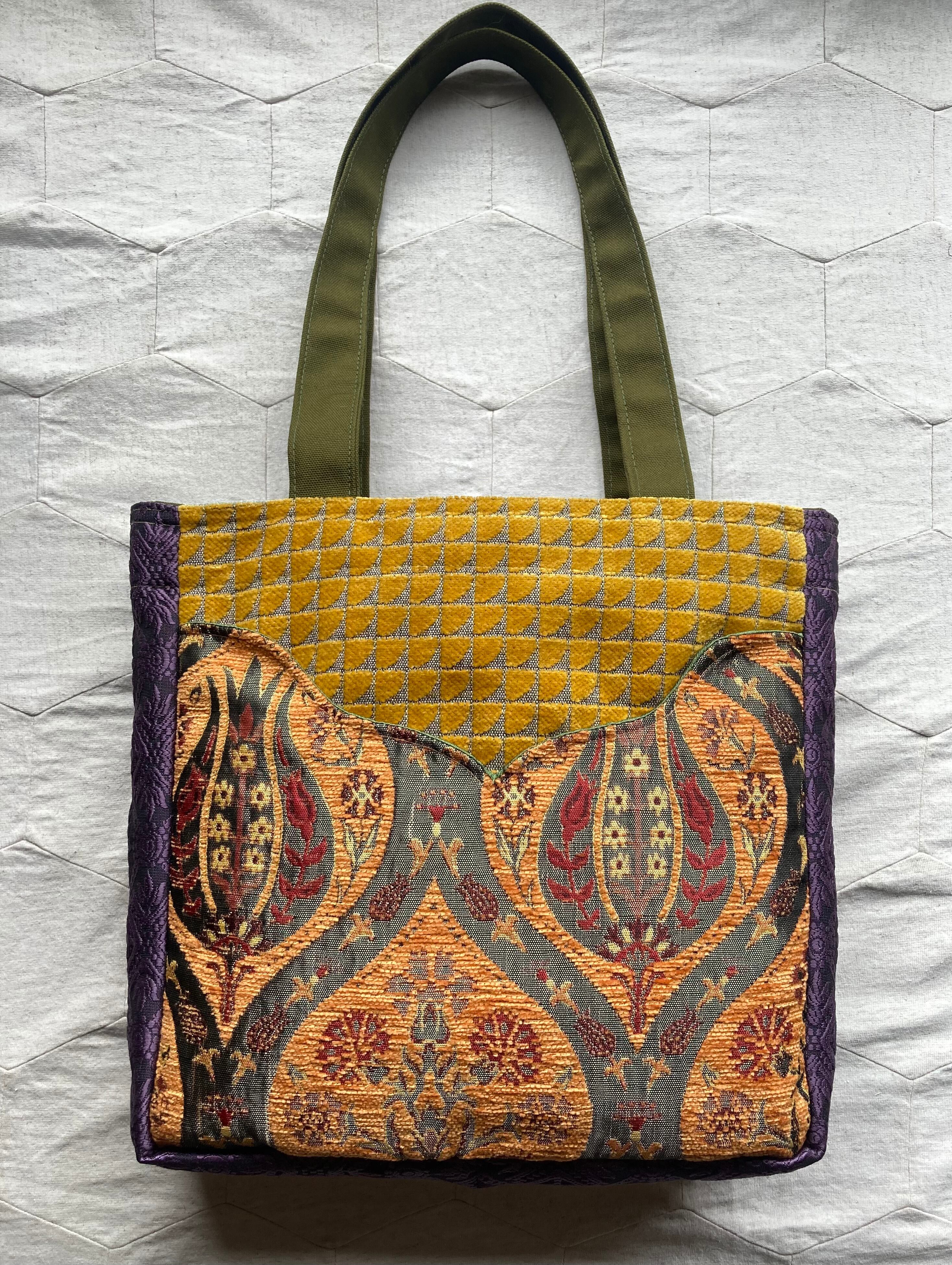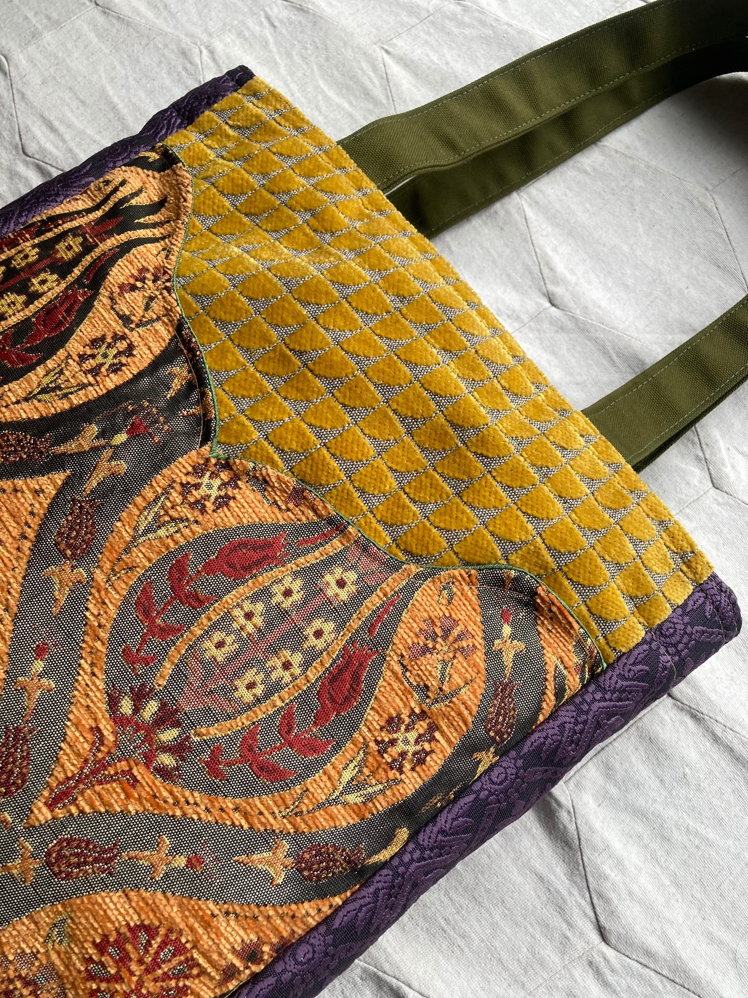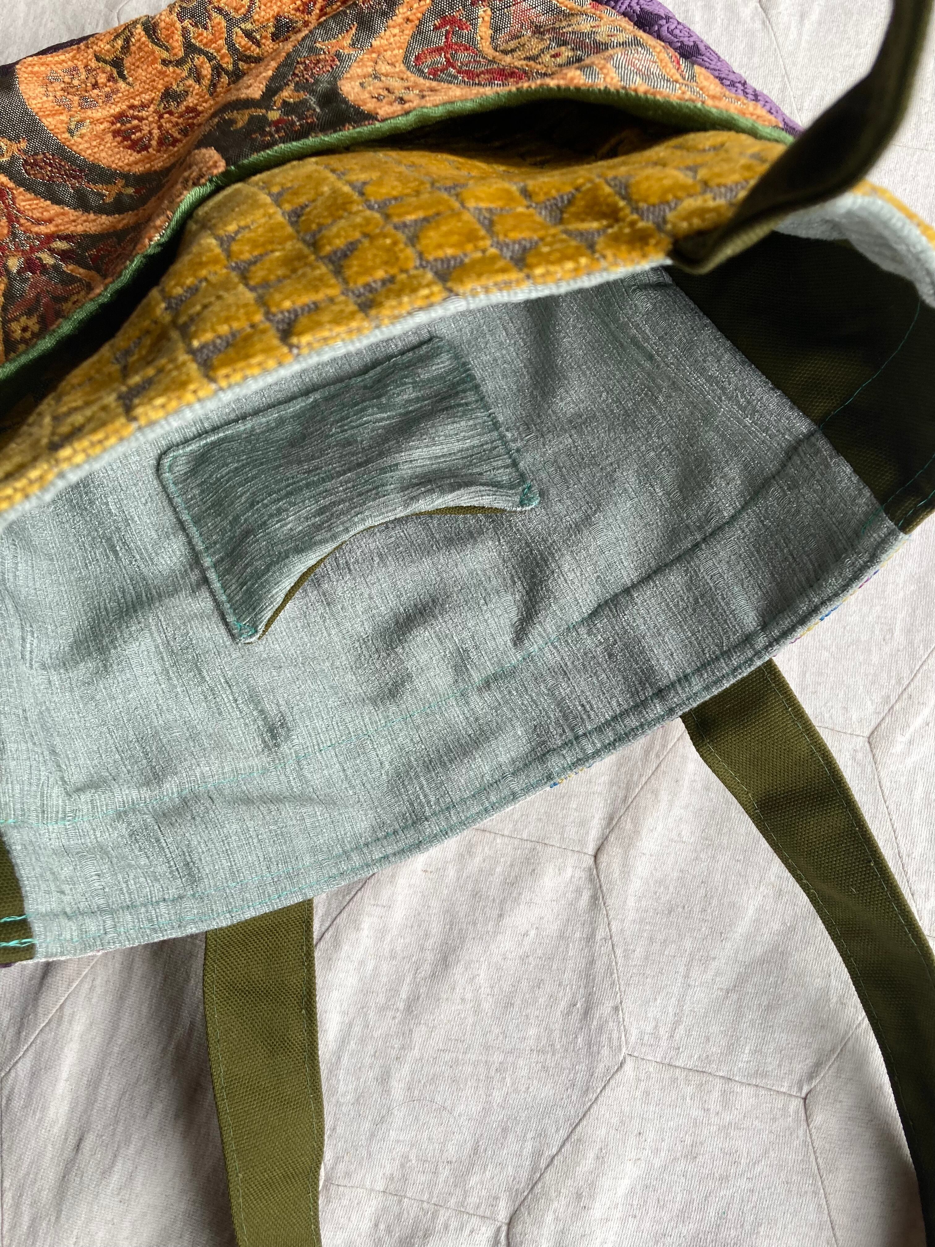 モロッコ生地をメインにランダムパッチワークしたサイドと、アラビックなポケットサイド、日によって両面楽しめてかわいいです。